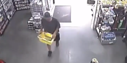 The picture shows the suspect in a t-shirt and shorts with the ball cap. He enteredShoplifter picture the store, grabbed a basket and proceeded to fill it with merchandise. He is then left a few minutes later without paying for the items. He even stole the basket.